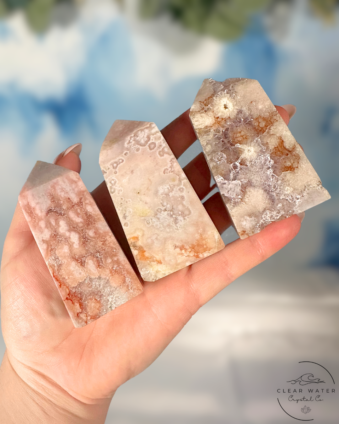 Each tower is unique and will showcase the distinct patterns of Flower Agate and the soft pink hues of Amethyst, sometimes with subtle banding or variations that add to its individual charm.
