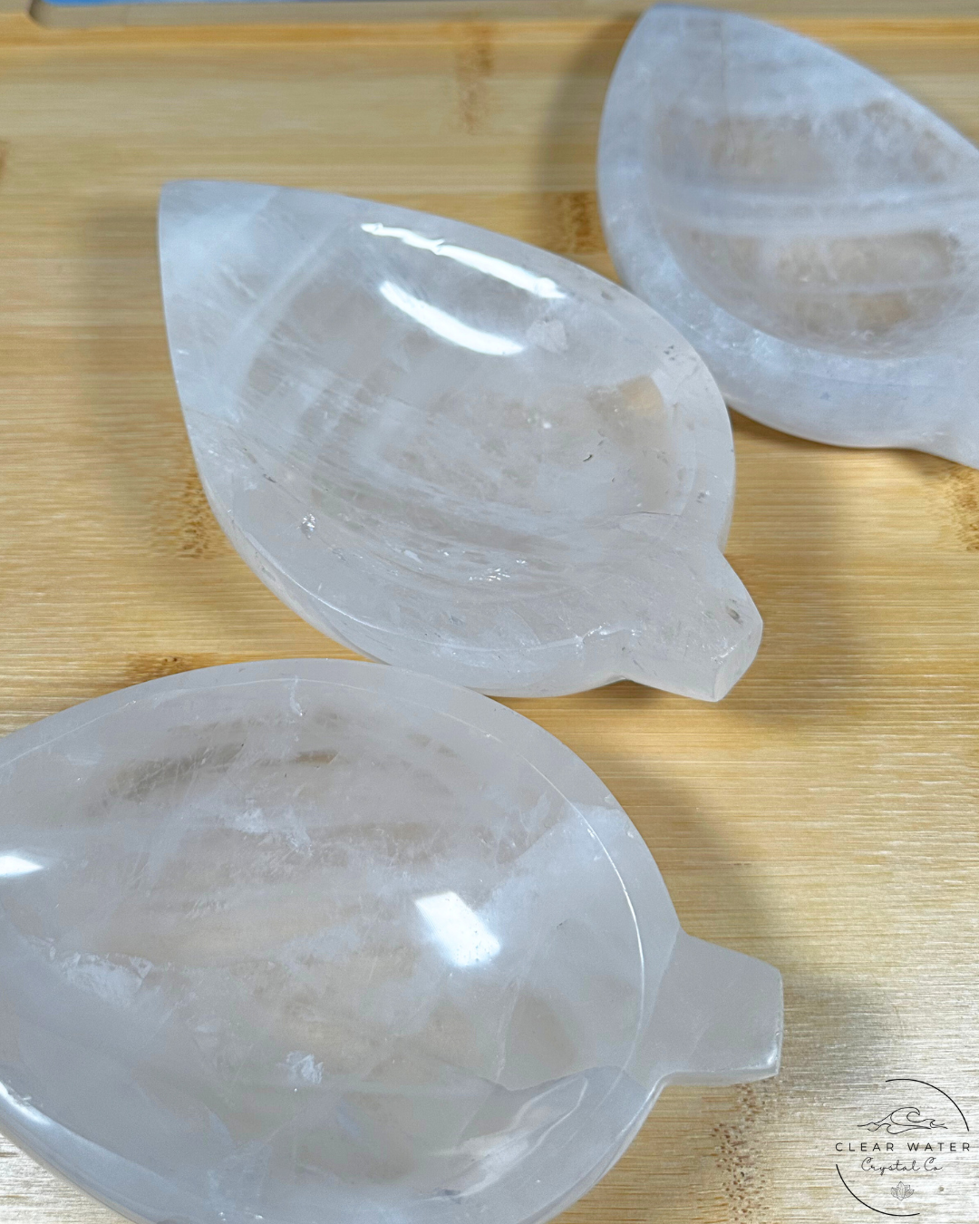 Each leaf bowl is a small altar in itself—perfect for holding tumbles, moon water, ritual herbs, intention notes, or tiny offerings. The leaf shape symbolizes growth, renewal, and the natural cycles of life, infusing your space with gentle grounding and fresh energy. The transparency of the quartz amplifies any item or intention placed within it, making these bowls powerful tools for manifestation and spiritual alignment.