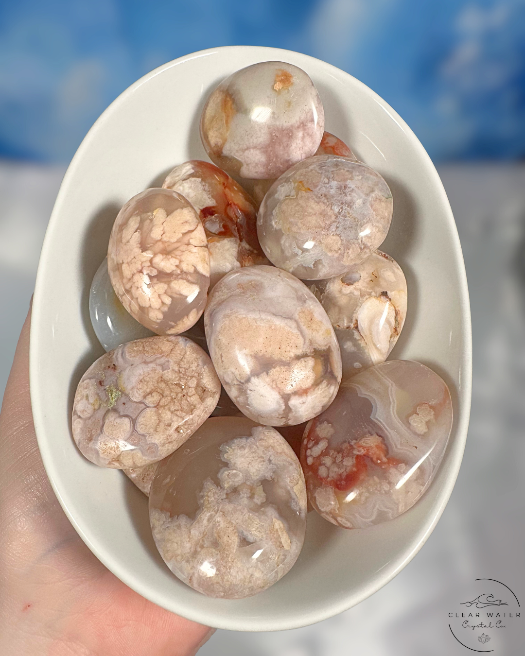 Each Flower Agate Pebble is a unique specimen, varying in size, the intensity of its pink, cream, and white tones, and the size, shape, and distribution of its delicate flower-like inclusions. You will receive an intuitively chosen stone that embodies the nurturing and growth-oriented energy of Flower Agate.