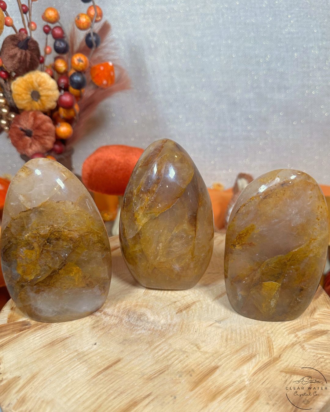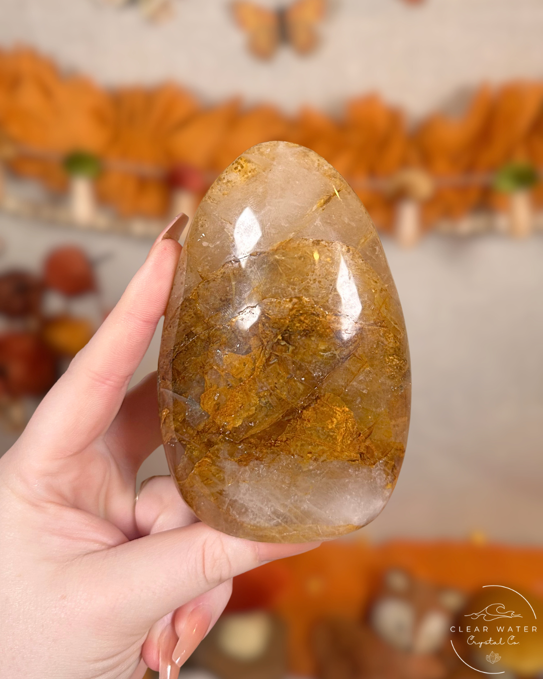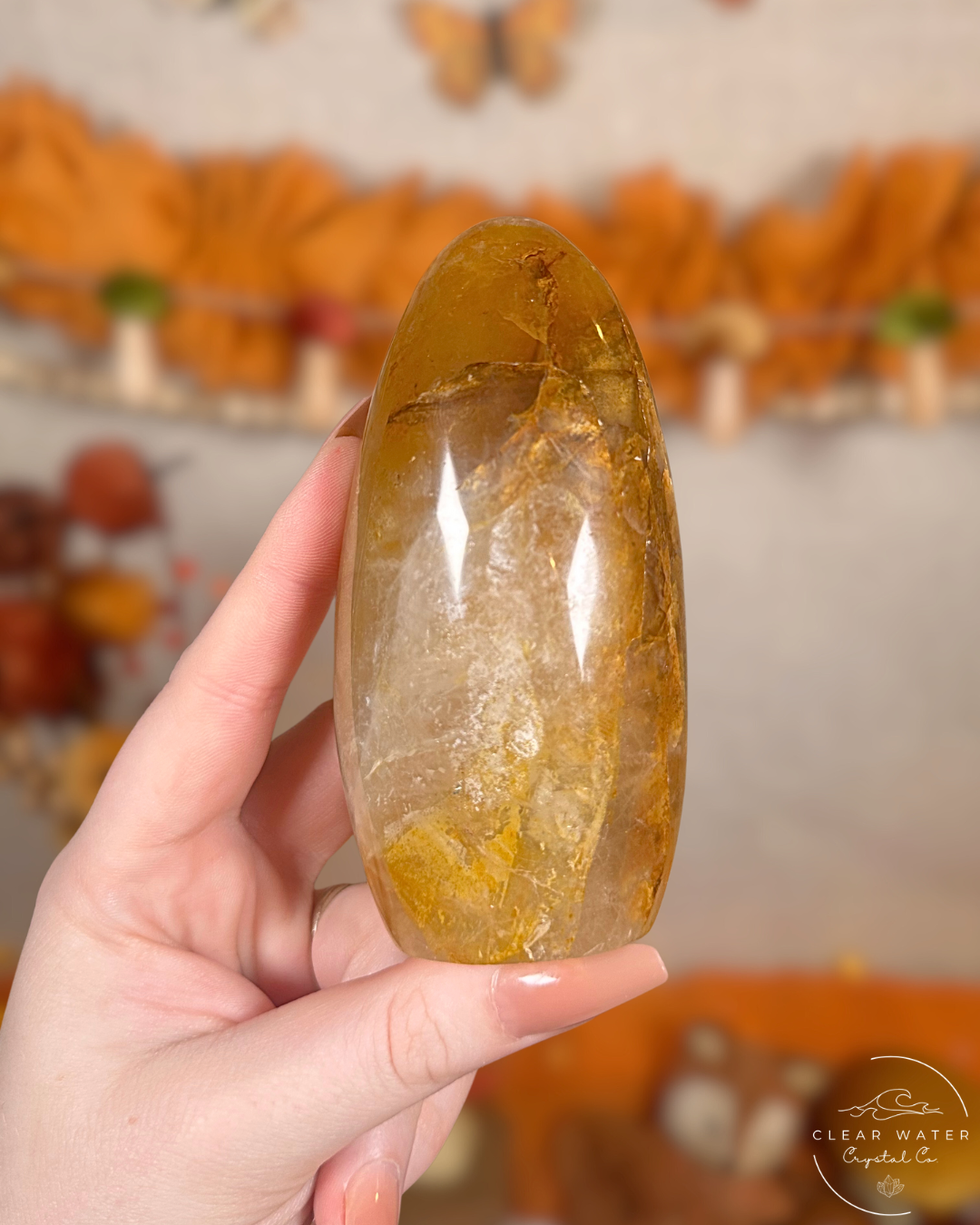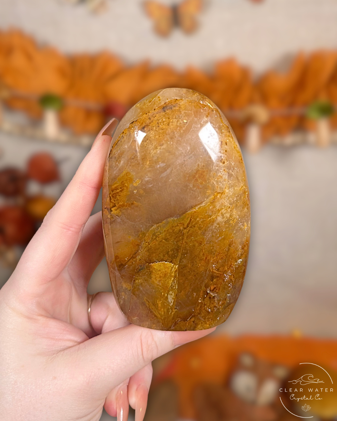 Richly saturated with iron inclusions, these Madagascan golden healer pieces glow with tones of deep honey, amber, and golden-brown. The iron within the quartz is what gives each stone its vibrant warmth, transforming clear crystal into something that looks kissed by the sun at dusk. No two pieces are the same — some shimmer with translucent light, while others are swirled with grounding earthy tones.