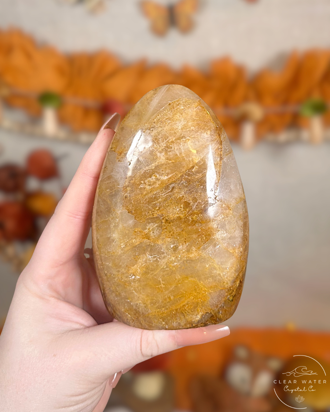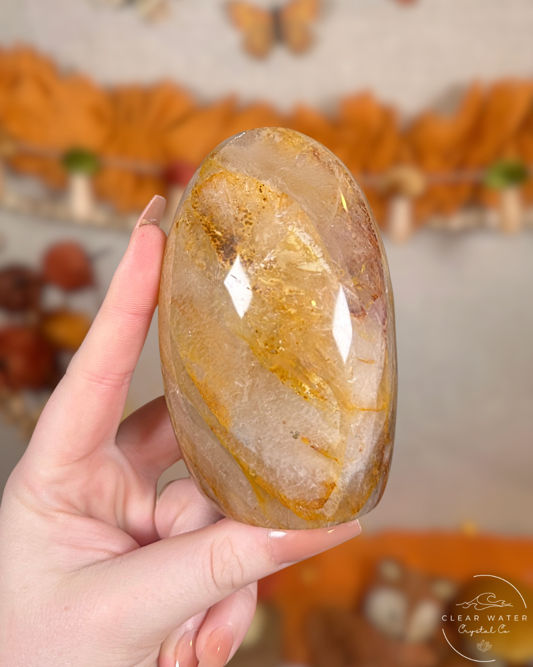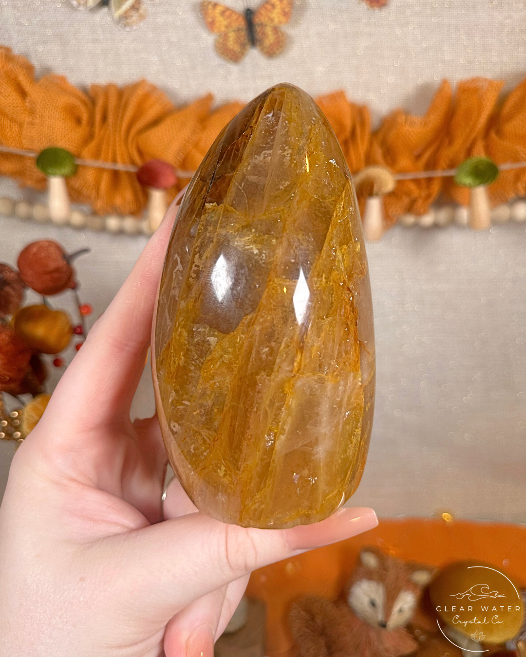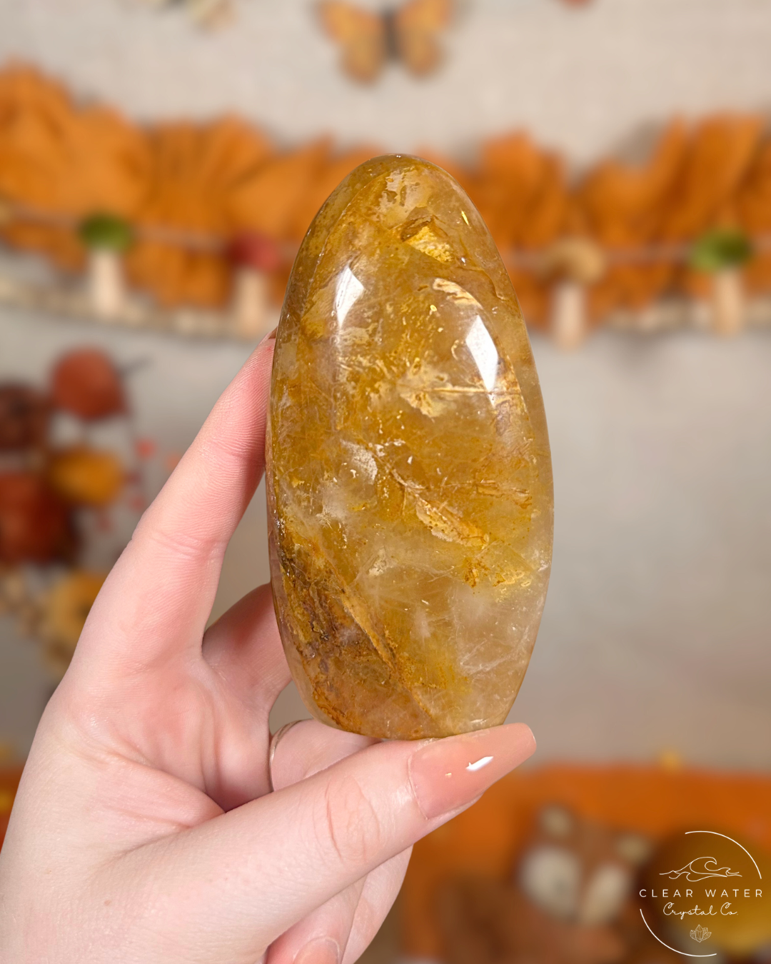 Richly saturated with iron inclusions, these Madagascan golden healer pieces glow with tones of deep honey, amber, and golden-brown. The iron within the quartz is what gives each stone its vibrant warmth, transforming clear crystal into something that looks kissed by the sun at dusk. No two pieces are the same — some shimmer with translucent light, while others are swirled with grounding earthy tones.