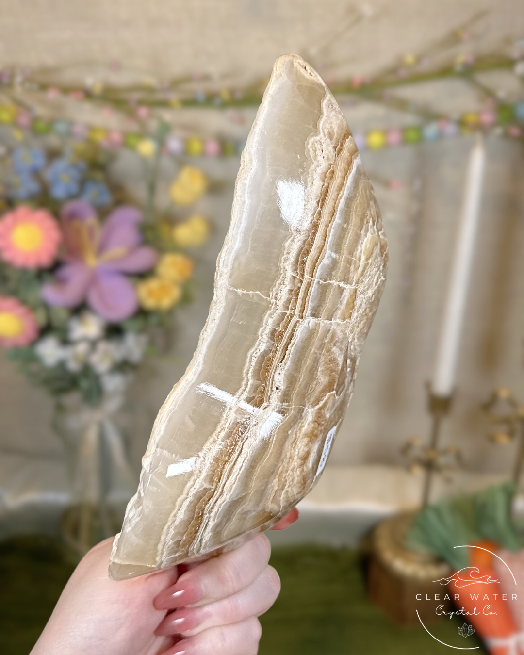 Warm, glowing, and beautifully organic, these large amber onyx bowls from Mexico showcase rich honeyed tones ranging from golden amber and caramel to creamy ivory. Natural banding flows through the stone, while the polished interior highlights the mineral’s gentle translucence, allowing light to pass through and illuminate the bowl with a soft, sunlit glow.