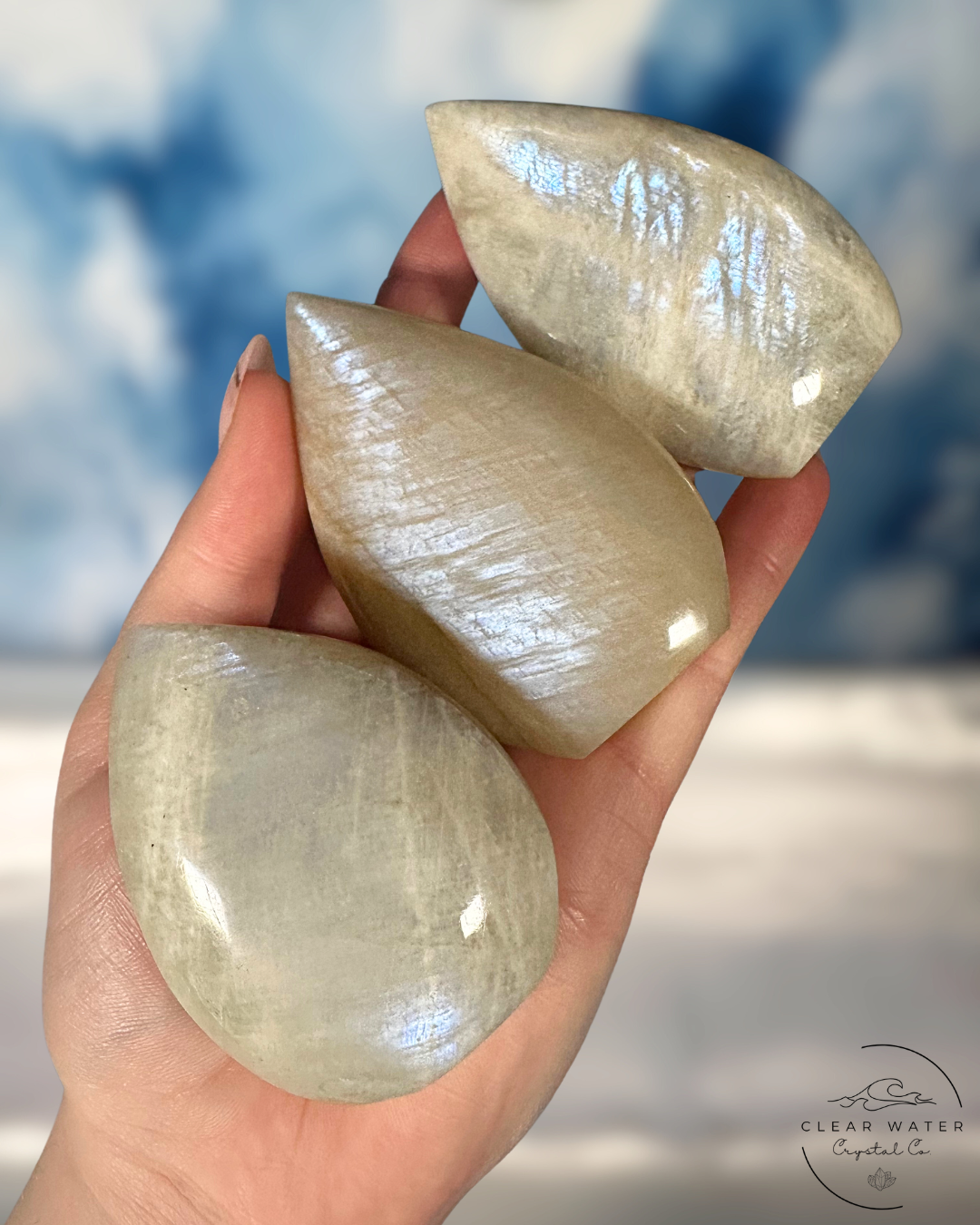 What truly sets these pieces apart is the breathtaking electric blue and pure white flash that shimmers across their surfaces as they catch the light. This optical phenomenon, known as adularescence, is particularly vibrant and striking in these high-quality moonstones, creating an almost otherworldly glow that seems to emanate from within.