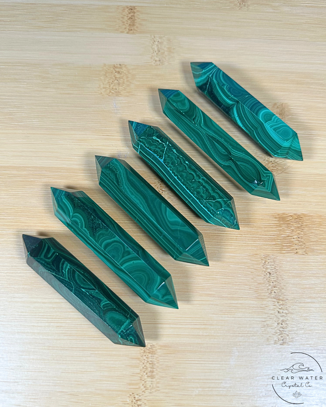 Immerse yourself in the rich, verdant energy of our Malachite Double Terminated Points. These captivating crystals showcase the mesmerizing swirls and bands of deep green that make Malachite so iconic, expertly shaped into powerful double terminated points.