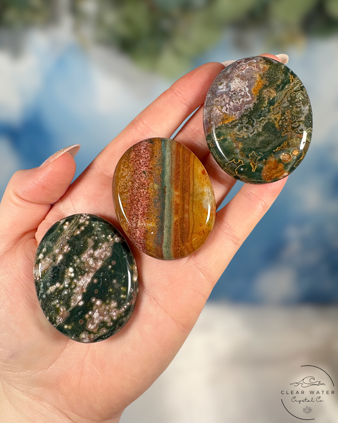 Sea Jasper, often called Ocean Jasper, showcases an incredible array of patterns and hues reminiscent of the sea – swirling "orbs" or "eyes" in shades of green, blue, cream, brown, and sometimes even pink or red. Each worry stone is a unique miniature seascape, reflecting the vastness and serenity of the ocean. The perfectly smooth, polished surface is incredibly comforting to the touch, making it ideal for soothing frayed nerves and promoting a meditative state.
