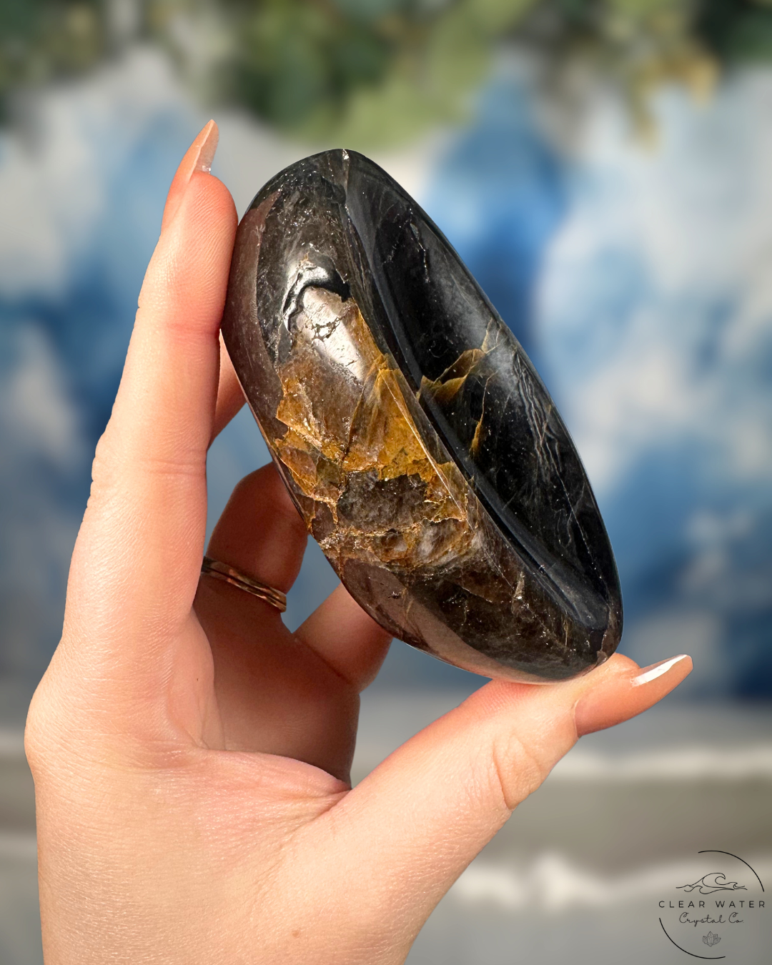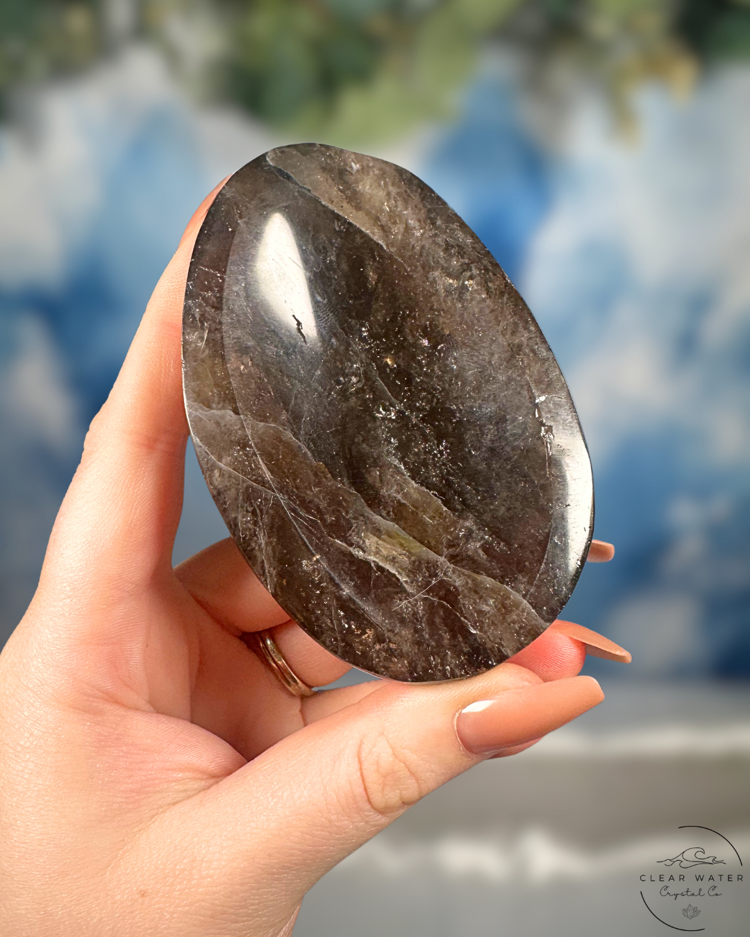 Each bowl is hand-carved in a smooth, minimalist form, with subtle natural inclusions and variations in tone—from translucent ash-gray to deep, earthy bronze. Some rare pieces even hold golden hematite inclusions, sparkling like drops of sunlight caught in stone—bringing in an added layer of manifestation energy, confidence, and solar magic.